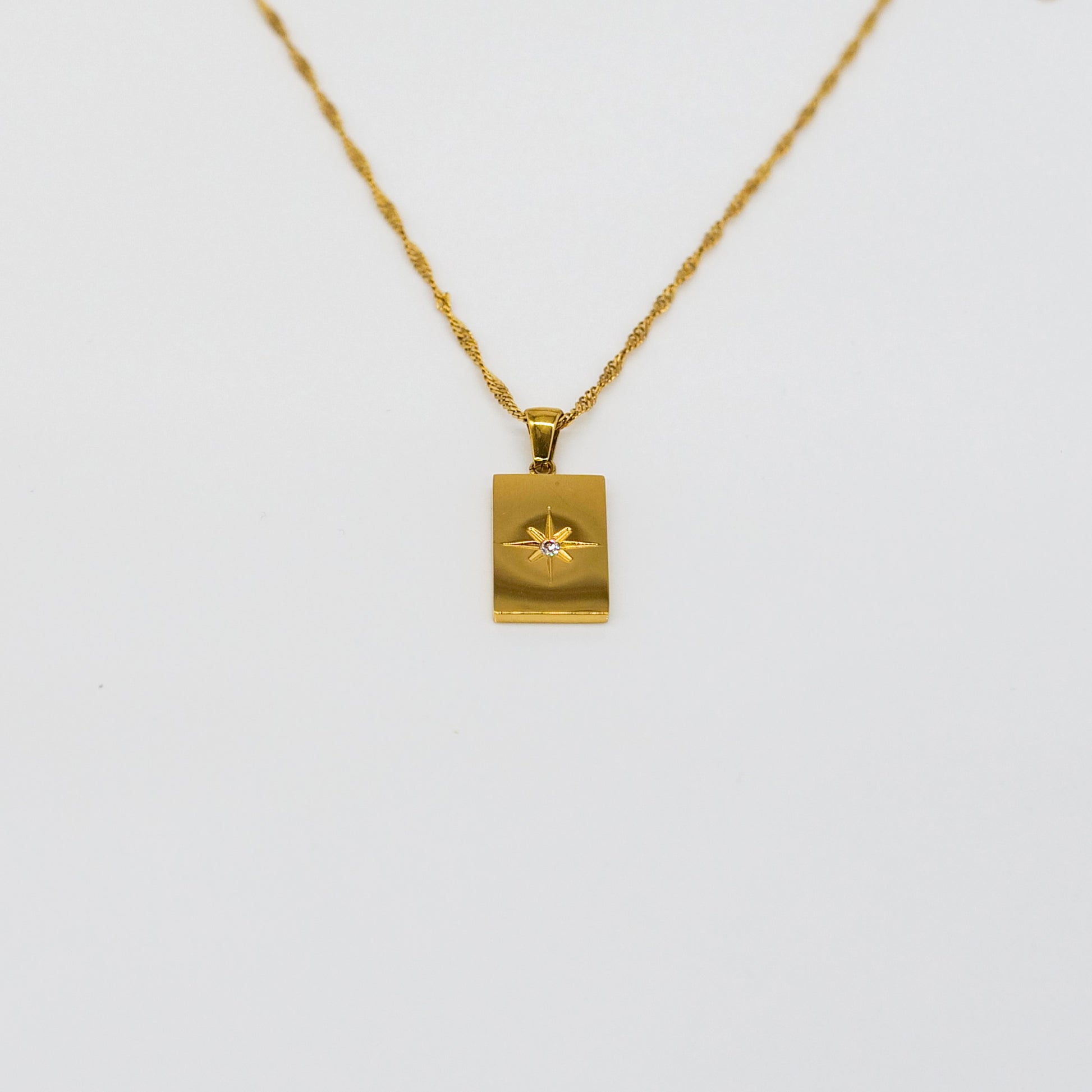 Ce collier élégant présente un pendentif rectangulaire orné d’une étoile délicate au centre, plaqué or 18K sur acier inoxydable. Un bijou moderne, résistant à l’eau et hypoallergénique, idéal pour sublimer toutes vos tenues. Garantie 1 an.